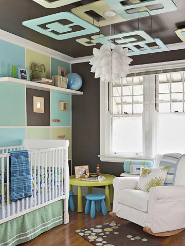 How cool is this nursery? I just love the soft color palette and the mod design. Some great design elements...the painted grid on the wall and the hanging ceiling panels.
